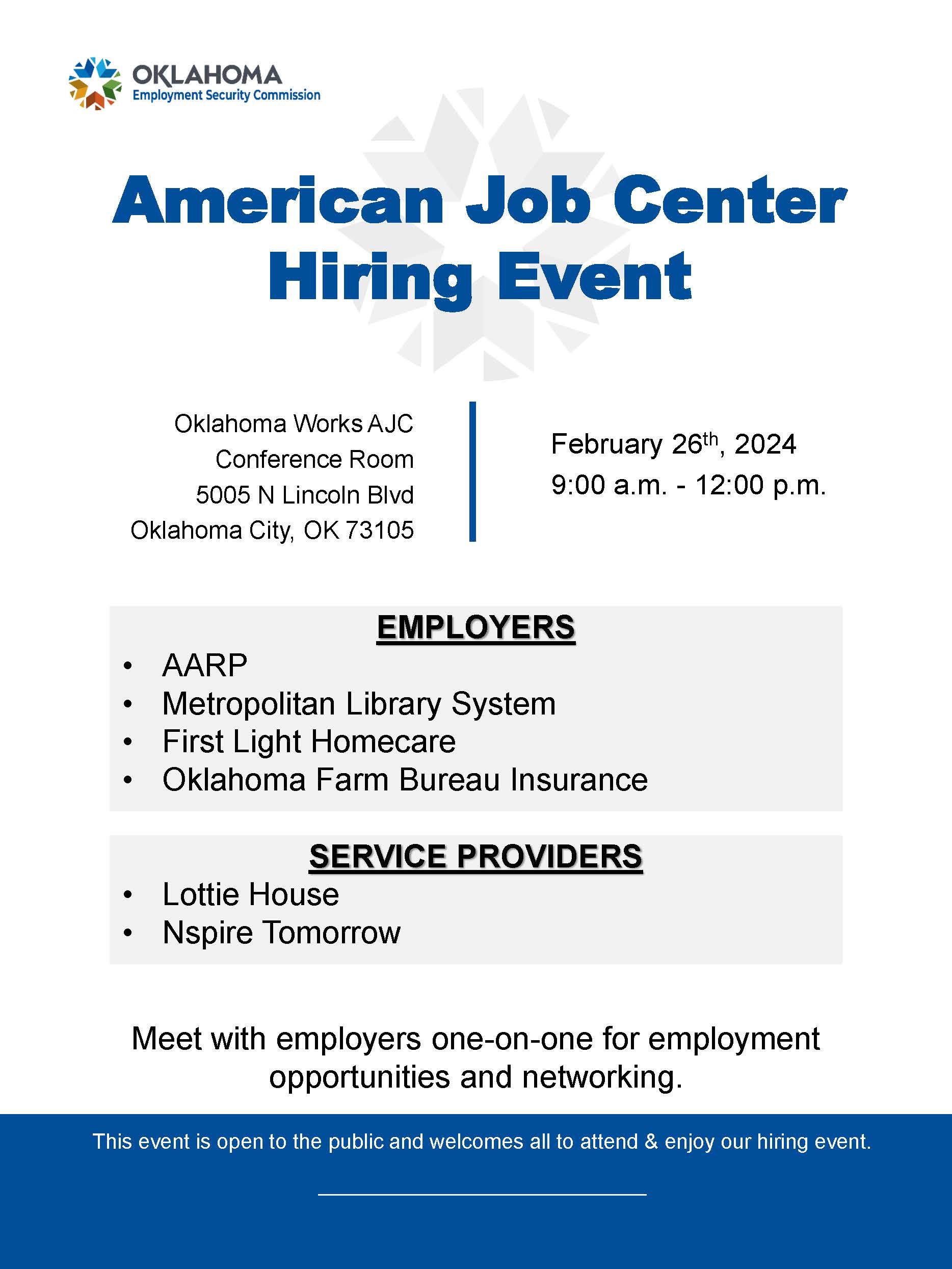 Events American Job Center Hiring Event February 26th, 20249:00 a.m. – 12:00 p.m. See the flyer for more info. ← Community Celebration! ACLU-OK 2024 Advocacy Day →