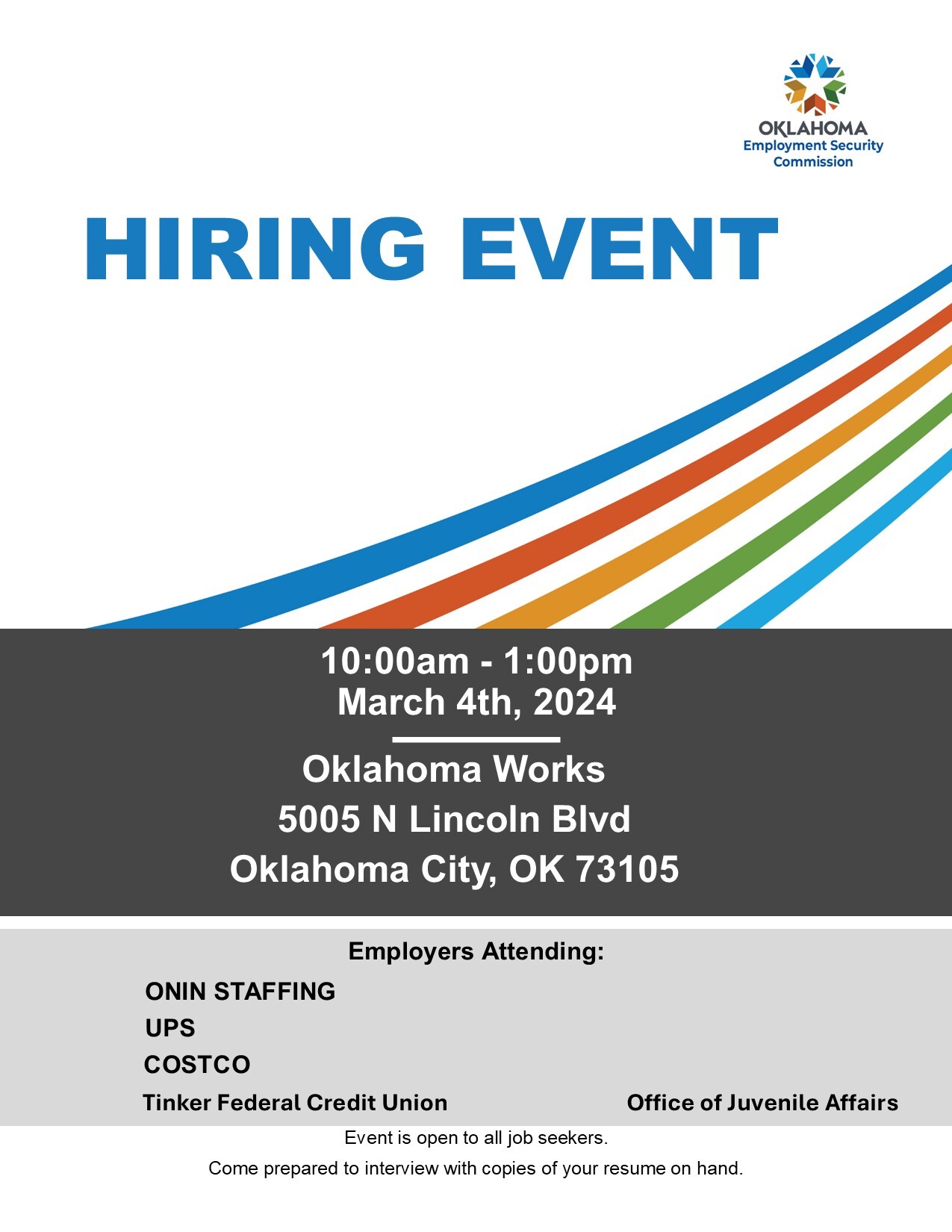 Events OK Employment Security Commission Hiring Event March 4th, 202410:00 a.m. – 1:00 p.m. See the flyer for more info. ← ACLU-OK 2024 Advocacy Day OK County Warrant Clearing Event →